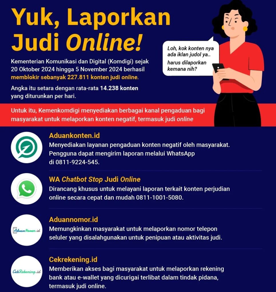 Untuk menekan penyebaran konten dan aktivitas judi online, pemerintah mengimbau masyarakat agar lebih waspada dan segera melaporkan indikasi yang ditemukan melalui platform resmi seperti AduanKonten.id.