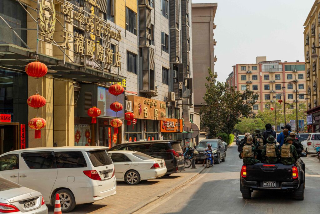 Members of the Karen Border Guard Force (BGF) patrol during a crackdown operation on illicit activity linked to scam centres in Shwe Kokko in Myanmar’s eastern Myawaddy township on February 18, 2025. Battered and bruised Chinese workers from online scam centres in Myanmar faced an anxious wait to be returned home, as Beijing and Thailand on February 19 finalised plans for their repatriation. (Photo by AFP)